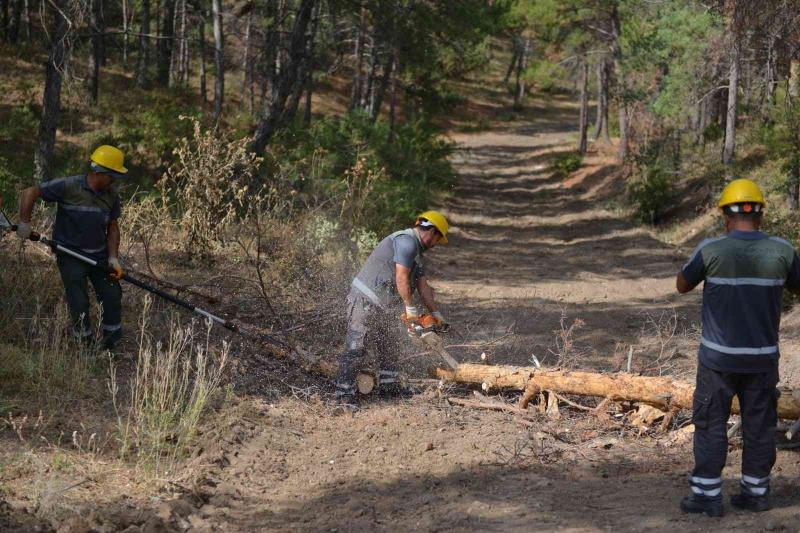 Çorum Belediyesi ile Orman İşletme Müdürlüğü ekipleri, Bahabey Çamlığı’nda istilacı böceklerin kuruttuğu ağaçları temizliyor.
