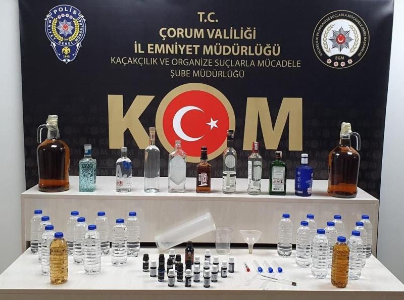 Çorum’da polis ekipleri tarafından düzenlenen operasyonda çok sayıda el yapımı kaçak alkollü içki ele geçirildi.