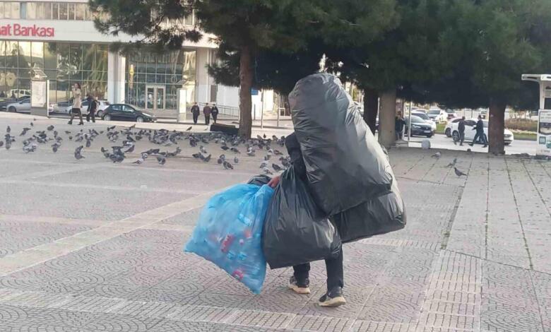 Samsun Cumhuriyet Meydanı’nda, geri dönüşüm malzemeleriyle dolu dev torbaları sırtlayarak yürüyen yaşlı vatandaşın görüntüsü, hayat mücadelesinin görünmez yüzünü bir kez daha ortaya koydu.