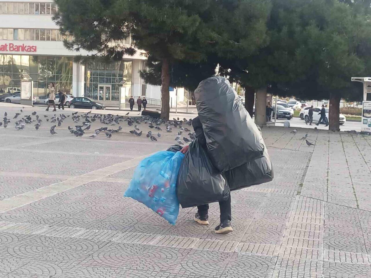 Samsun Cumhuriyet Meydanı’nda, geri dönüşüm malzemeleriyle dolu dev torbaları sırtlayarak yürüyen yaşlı vatandaşın görüntüsü, hayat mücadelesinin görünmez yüzünü bir kez daha ortaya koydu.