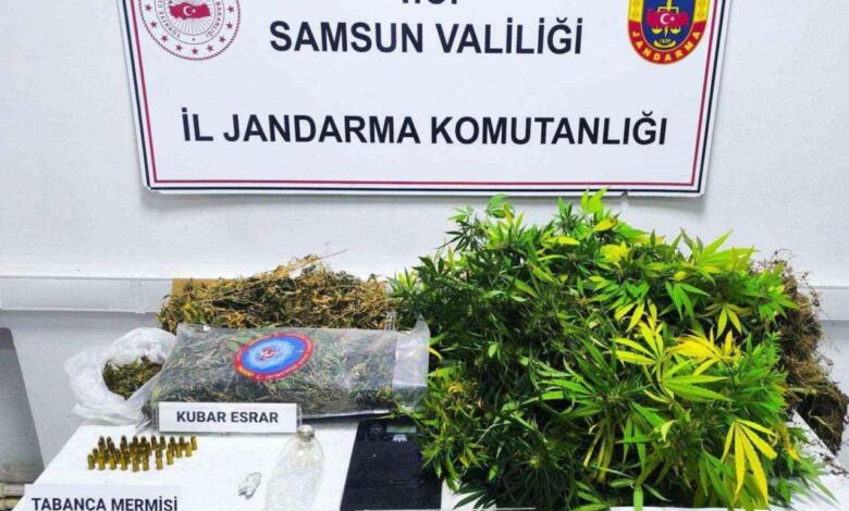 Samsun İli Çarşamba ilçesinde, jandarma ekipleri tarafından uyuşturucu ve uyarıcı madde ticaretinin önlenmesine yönelik yürütülen çalışmalar kapsamında U.S. (44) isimli şahsın uyuşturucu bulundurduğu bilgisine ulaşıldı. Samsun İl Jandarma Komutanlığı Narkotik Şube Müdürlüğü, Çarşamba İlçe Jandarma Komutanlığı ve Çarşamba JASAT ekipleri tarafından şahsın evinde ve evin deposunda yapılan aramada, evde ve evin deposunda yapılan aramada, 1 kilo 985 gram kubar esrar, 63 kök skunk bitkisi, 1 adet hassas terazi, 2 adet uyuşturucu kullanma aparatı ve 35 adet tabanca fişeği ele geçirildi.