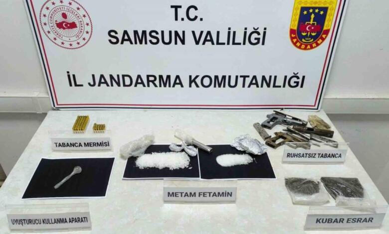 Edinilen bilgiye göre, Samsun’un Çarşamba ilçesinde jandarma ekiplerinin uyuşturucu ticaretinin önlenmesine yönelik yürüttüğü çalışma kapsamında bir şahsın evine operasyon düzenlendi. Yapılan aramada 235 gram metamfetamin, 126 gram kubar esrar, 2 adet ruhsatsız tabanca ve 1 adet uyuşturucu kullanma aparatı ele geçirildi.