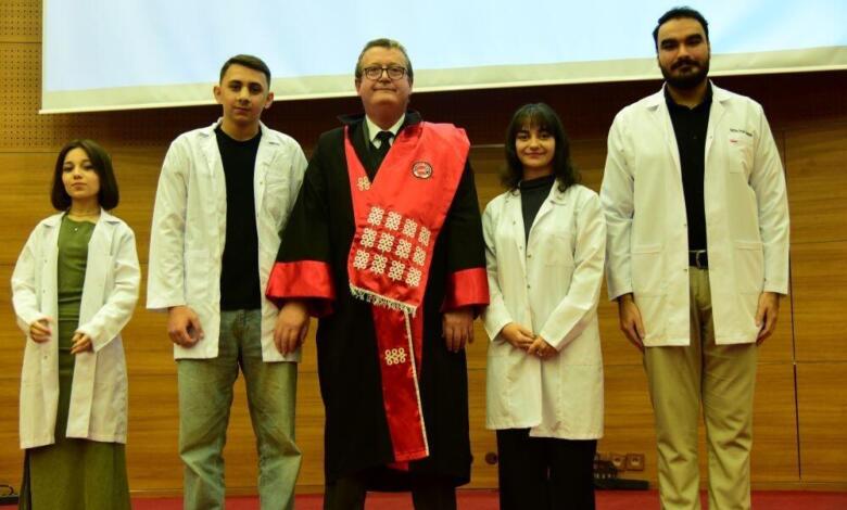 Konuşmasının ardından Prof. Avcı, Tıp Fakültesi’ne birincilikle yerleşen Bayram Burak Karakay ile birinci sınıfı birincilikle tamamlayan Nisa Duru Bora’ya hediye takdim etti.
