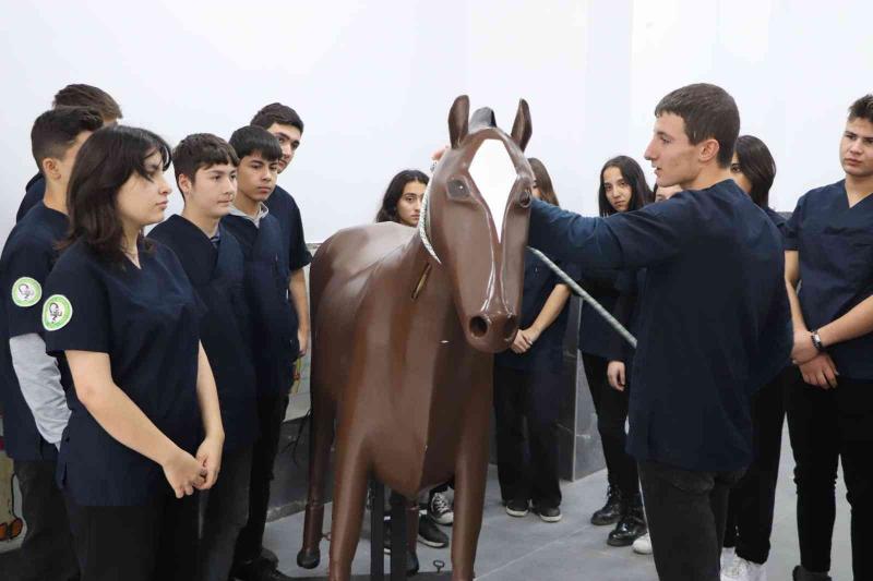 Veteriner Hekim ve hayvan sağlığı öğretmeni Yaşar Şahin ise “Öğrencilerimize burada sahaya çıkmadan önce el ve kas koordinasyonlarını geliştirmek, öğrendikleri teorik bilgileri pratik şekilde hayata geçirebilmek için daha öncesinden burada uygulama yaparak mesleğe atılmalarına kolaylık sağlıyoruz. Ders materyalleriyle uygulamalı şekilde ders yapınca çocuklar daha çok eğleniyorlar. Mesleğe karşı el becerileri daha çok artmış oluyor. Öğrencilerimiz stajlara gidiyorlar ve çok iyi geri dönüşler alıyoruz. Staj yerlerindeki işletmelerden gelen cevaplar genelde ‘hocam öğrenciler çok başarılılar’ şeklinde oluyor. Bunların en büyük katkısı burada kullandığımız at, sığır ve materyallerimizin sayesinde oluyor” şeklinde konuştu.