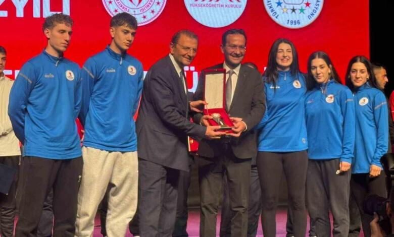 TÜSF Başkanı Prof. Dr. Mutlu Türkmen tarafından takdim edilen ödül, OMÜ Genel Sekreteri Erhan Burak Pancar ile Avrupa’da madalya kazanan sporcuların katılımıyla sahnede teslim alındı.