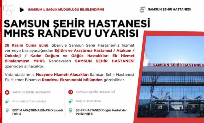 Yapılan açıklamada,”28 Kasım Cuma günü itibariyle Samsun Şehir Hastanemiz Canik ilçemizdeki ana binasında öncelikle Göğüs Hastalıkları Kliniğimizle hizmet vermeye başlayacaktır. Bu tarih itibariyle Eğitim ve Araştırma Hastanesi / Atakum / Onkoloji / Kadın Doğum binalarımız Samsun Şehir Hastanemize bağlı olarak hizmet vermeye başlayacağından, MHRS Randevuları da Samsun Şehir Hastanemiz üzerinden alınacaktır. Bu binalarımız Şehir Hastanemize fiziken entegrasyon süreçlerinde var oldukları binalarda hizmet sunacak, MHRS randevu ekranlarında da muayene yeri olarak bu alanlar belirtilmeye devam edecektir. Vatandaşlarımız MHRS Randevu ekranından, Şehir Hastanesi Ana Bina da mı yoksa Ek Hizmet Binalarından birinde mi hizmet alacakları bilgisine ulaşabilirler” denildi.
