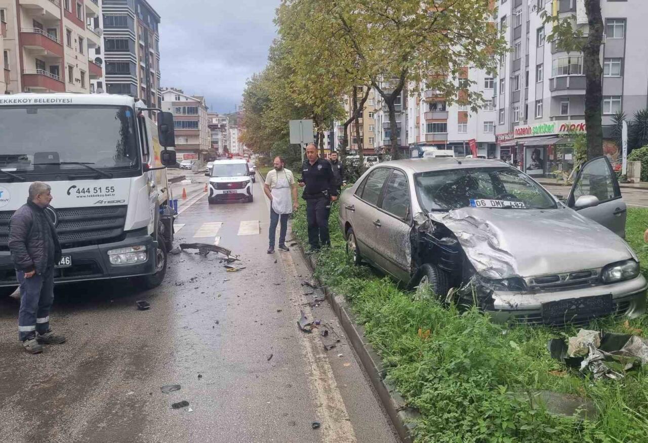 Kaza, Samsun’un Tekkeköy ilçesi 19 Mayıs Mahallesi Şeyh Zeynettin Caddesi’nde meydana geldi. Halil Korkmaz idaresindeki 06 DMK 482 plakalı otomobil, Çetin Topçu yönetimindeki 55 TB 146 plakalı Tekkeköy Belediyesine ait çöp kamyonuna çarptı. Çarpmanın etkisiyle otomobil yoldan çıkarak refüjün ortasında durabildi. Kazada yaralanan sürücü Halil Korkmaz, Gazi Devlet Hastanesine kaldırılarak tedavi altına alındı. Polis kazayla ilgili inceleme başlattı.