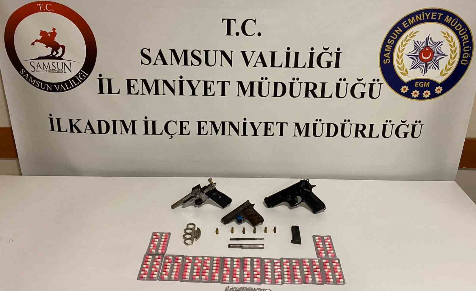 Edinilen bilgiye göre, Samsun Emniyet Müdürlüğü ekipleri İlkadım ilçesinde bir adrese operasyon düzenledi. Yapılan aramalarda; 2 adet ruhsatsız tabanca, 1 adet parçalı halde ruhsatsız tabanca, 5 adet fişek, 1 adet tabanca namlusu, 170 adet sentetik ecza, tek paket halinde 5 gram metamfetamin ve 1 adet muşta ele geçirildi. Olayla ilgili A.G. gözaltına alındı.