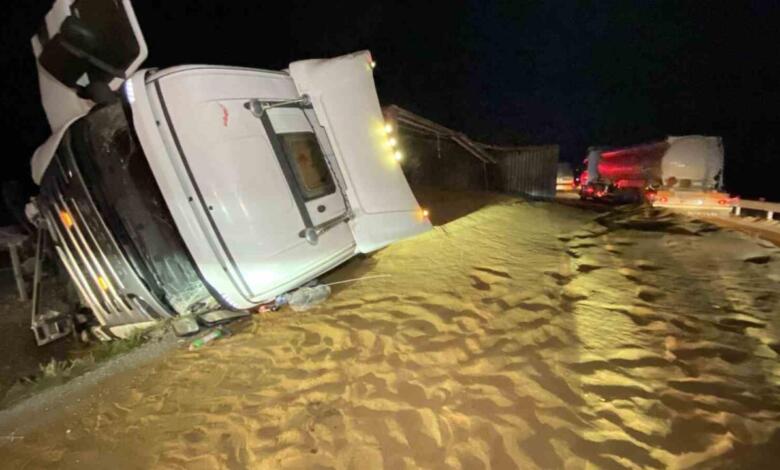 Tır devrildi, saçılan hayvan yemi yolu kapattı