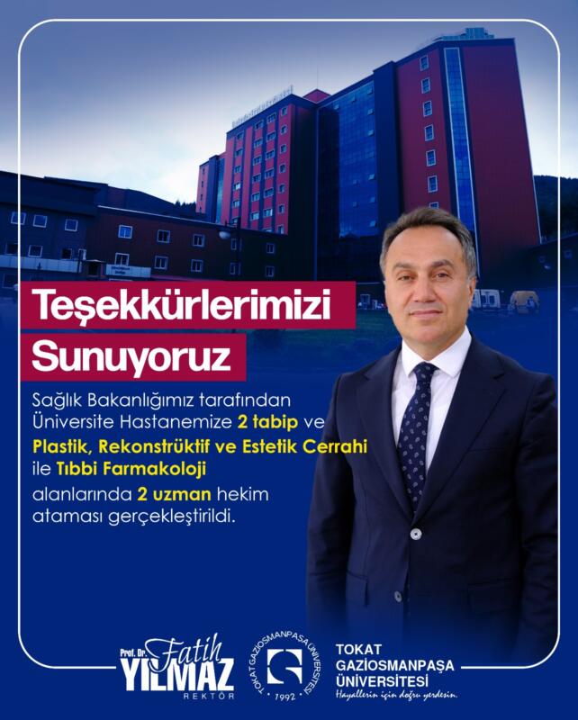 Tokat Gaziosmanpaşa Üniversitesi (TOGÜ) Rektörü Prof. Dr. Fatih Yılmaz, üniversite hastanesine yapılan yeni hekim atamalarıyla ilgili teşekkür mesajı yayımladı.
