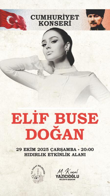 Tokat Belediyesi, Cumhuriyetimizin 102. yılı kutlamalarını büyük bir coşkuyla karşılamaya hazırlanıyor. Ünlü sanatçı Elif Buse Doğan, 29 Ekim Çarşamba günü Hıdırlık Etkinlik Alanı’nda Tokatlılarla buluşacak.