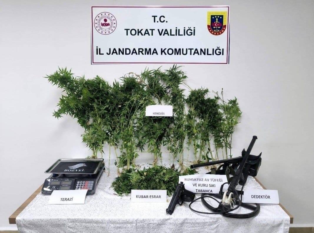 Tokat İl Jandarma Komutanlığı ekiplerince Zile, Turhal ve Erbaa ilçelerinde icra edilen operasyonlarda yapılan aramalarda; 370 gram bonzai, 1 kilo 37 gram kubar esrar, 10 gram metamfetamin, 51 kök kenevir bitkisi, ayrıca 1 kurusıkı tabanca, 1 av tüfeği, 1 dedektör, 1 elektronik terazi, 2 uyuşturucu kullanma aparatı ve 100 mililitre aseton ele geçirildi. Operasyon kapsamında gözaltına alınan 4 şüpheli hakkında adli işlem başlatıldı.